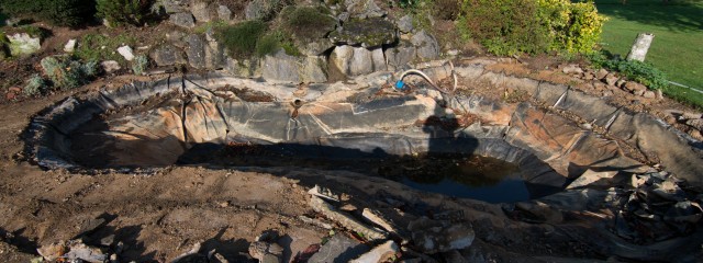 Pond Re-lining, Sand and Underlay The next stage was to start re-lining the pond. The first step was to add builders sand and off-cuts of liner which were used on the damaged sections of the old underlay. The new underlay was then used to line the pond, this new sheeting stops stones or roots from […]Continue Reading
