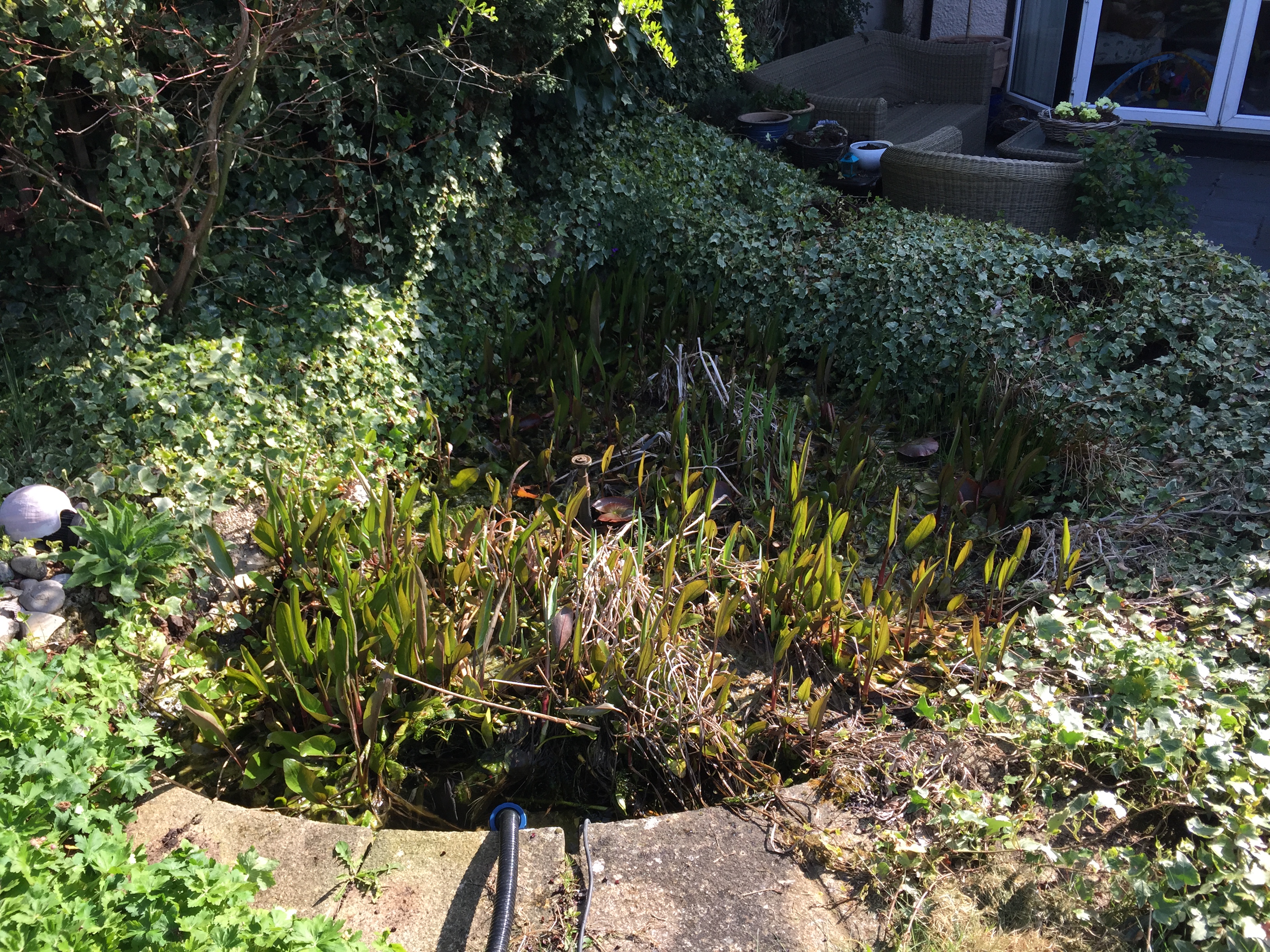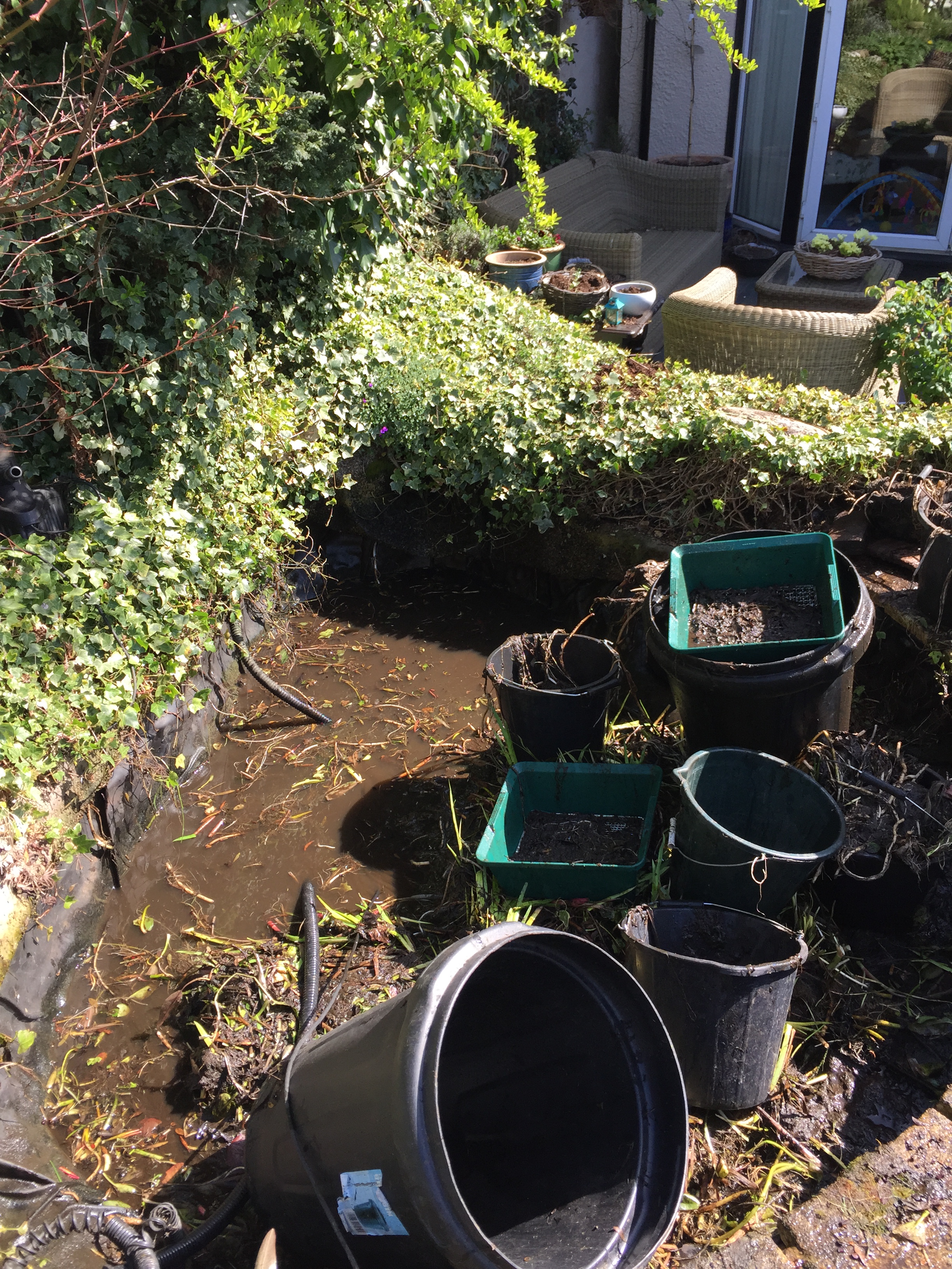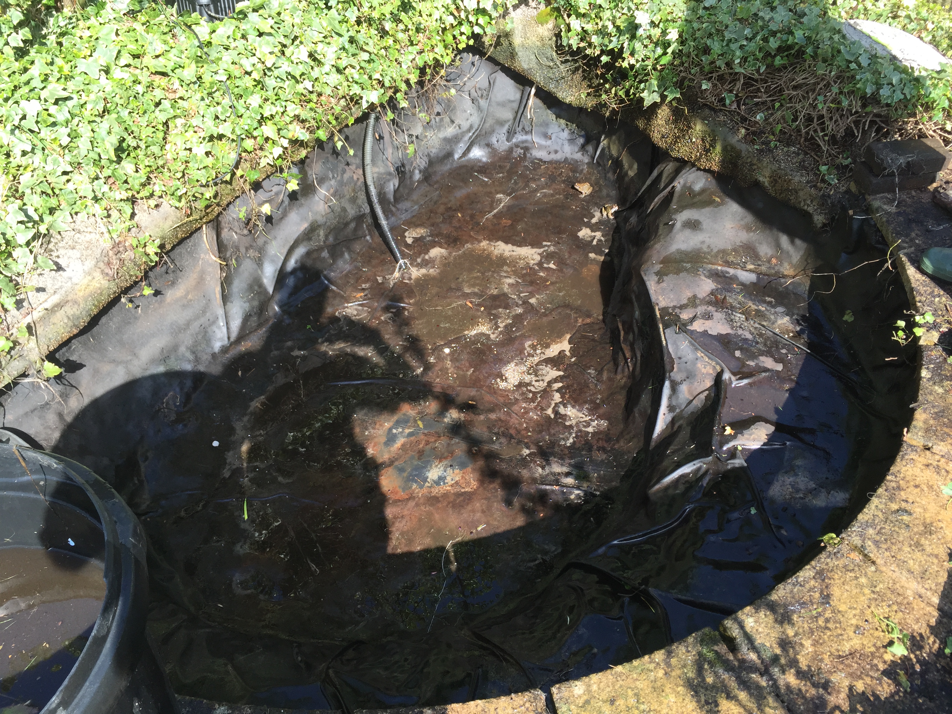 The pond was completely emptied with all aquatic life, fish newts and frogs being kept in temporary holding for the day while the pond was emptied. Years of pond sludge was removed and put on the flowerbeds.