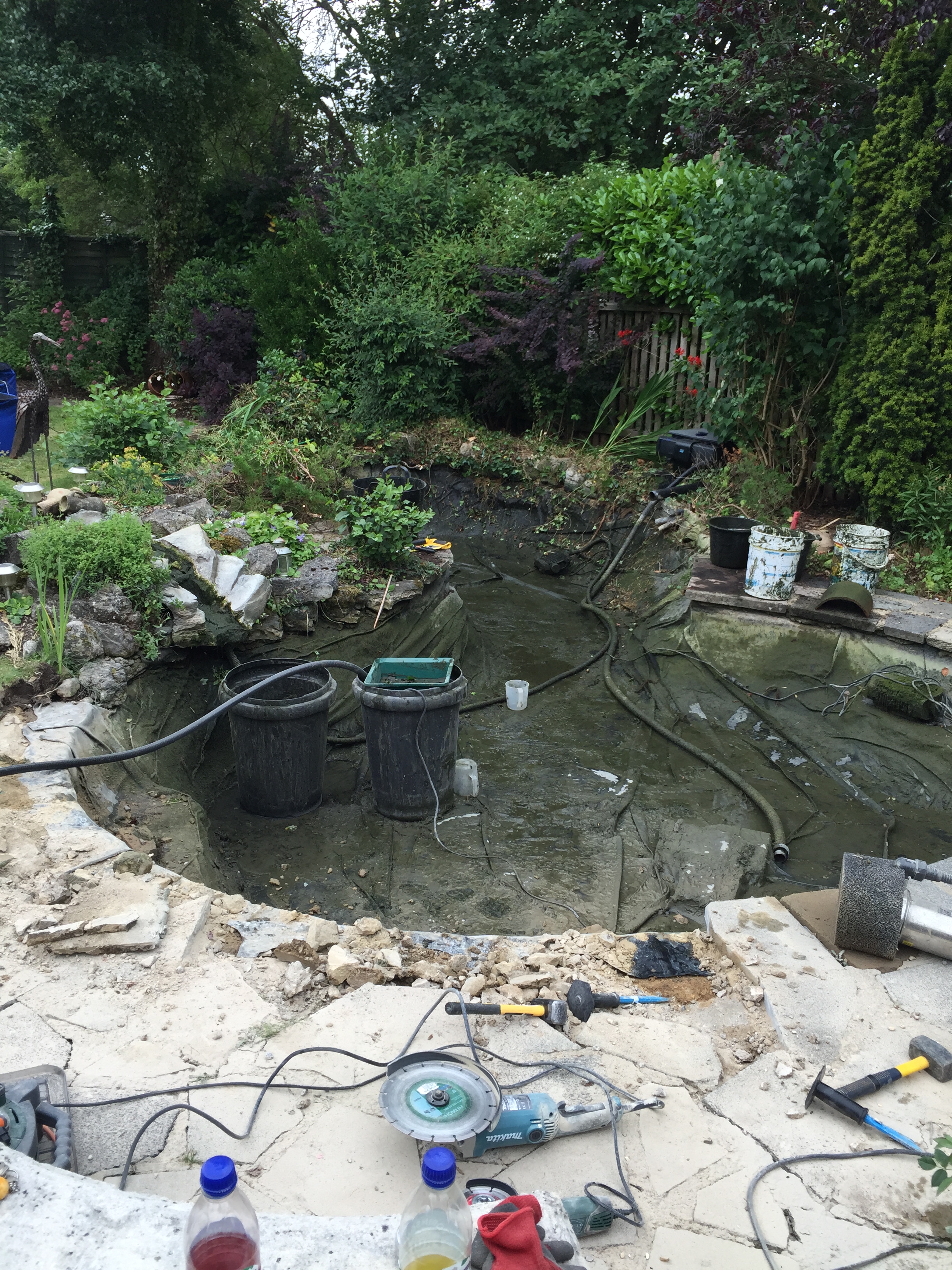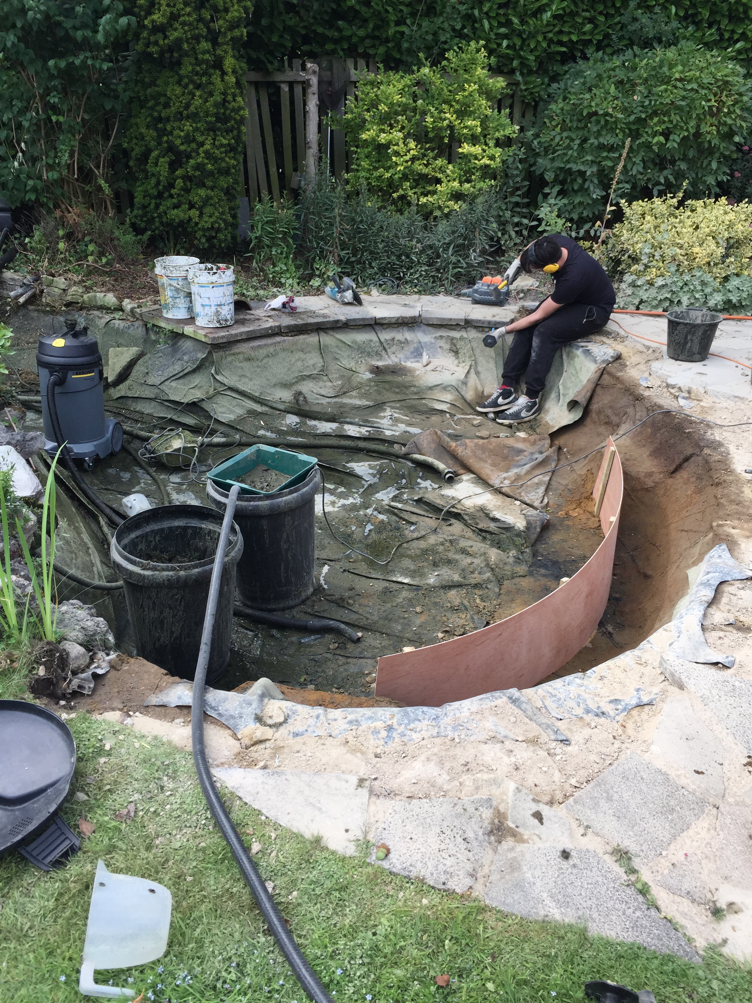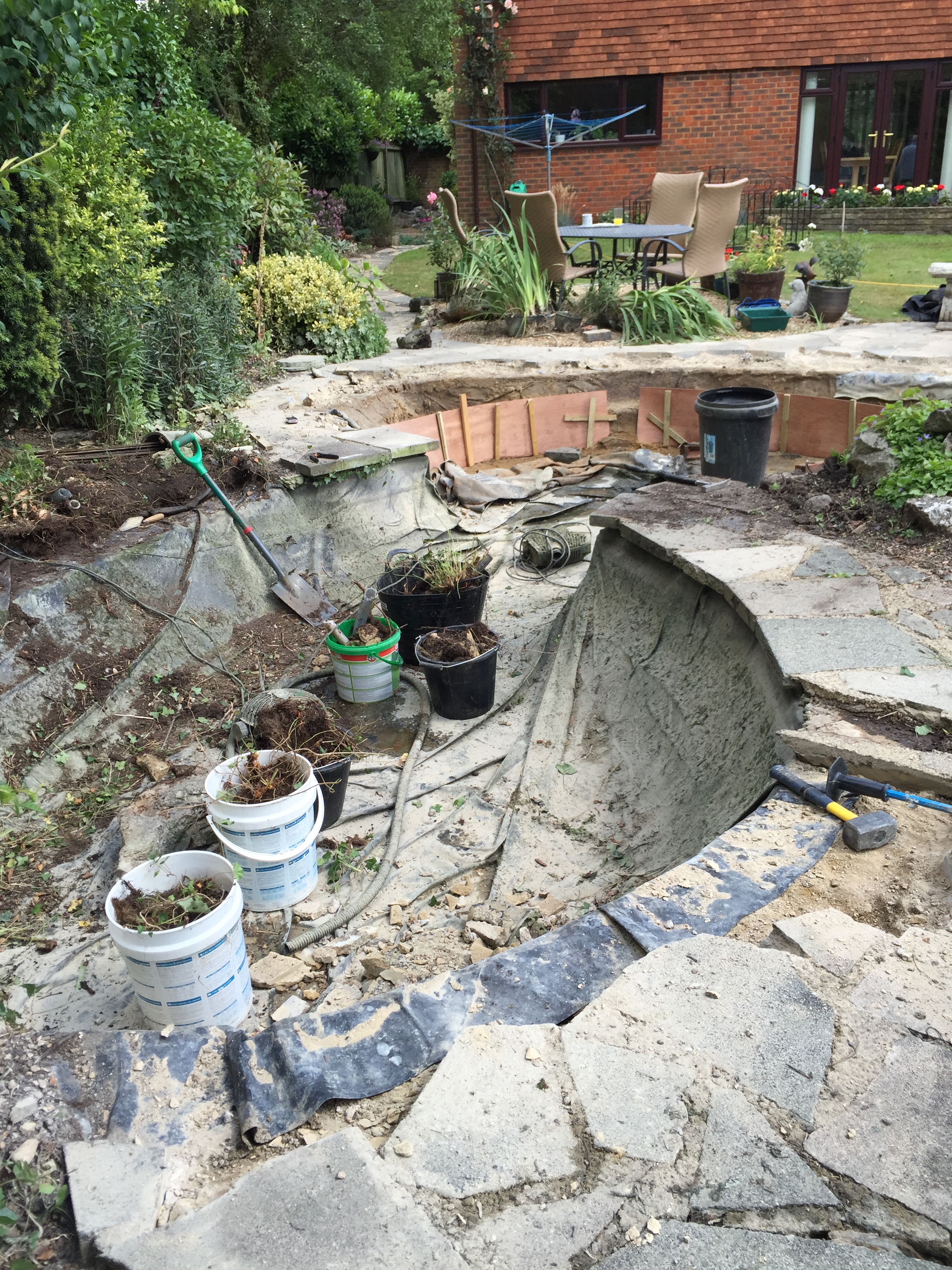 The pond had been overgrown for many years so a lot of initial pruning work had to be done before the edging at the back of the pond could be removed. The crazy paving was carefully removed around the ponds edge along with the large natural rock edge.