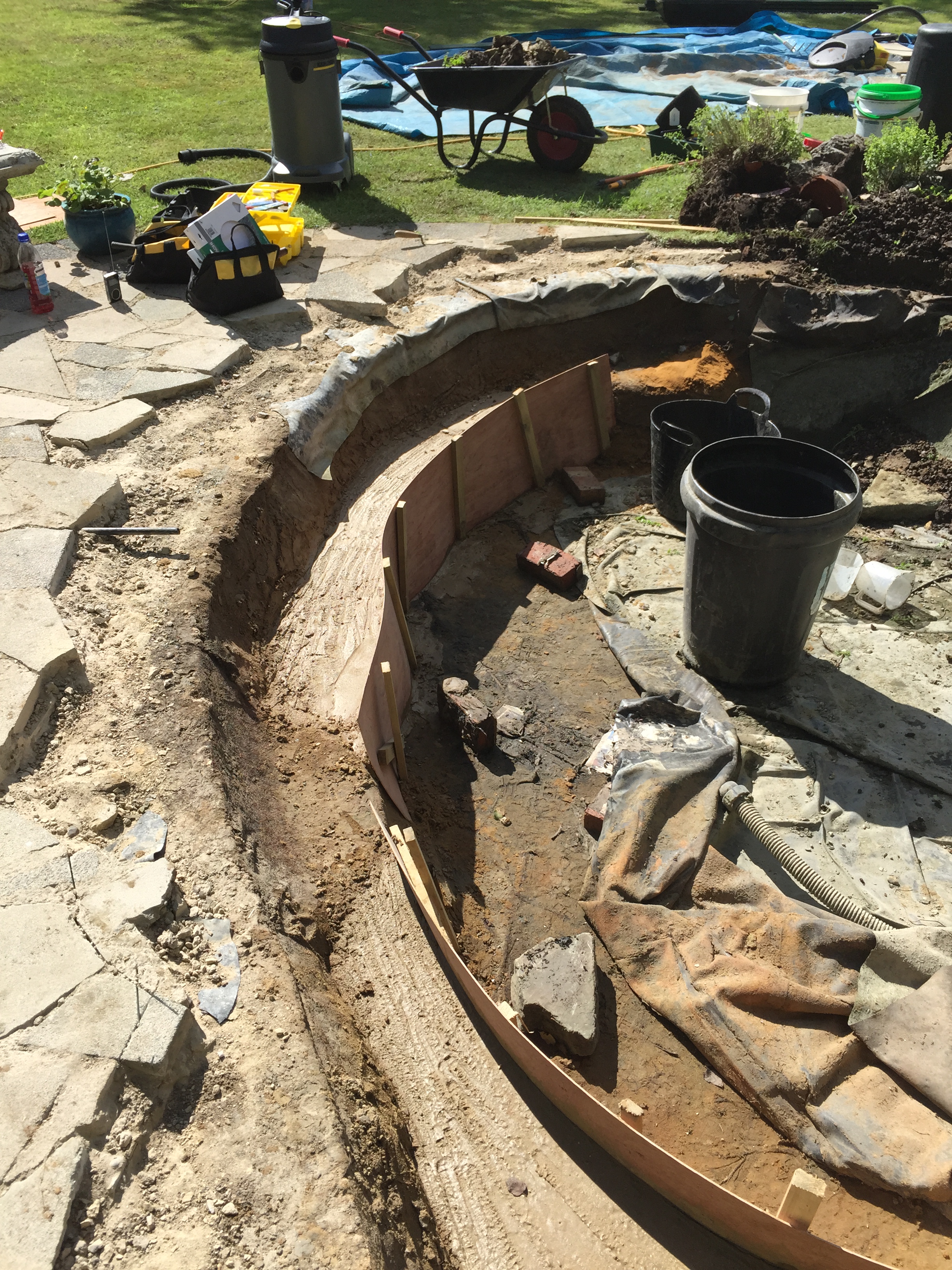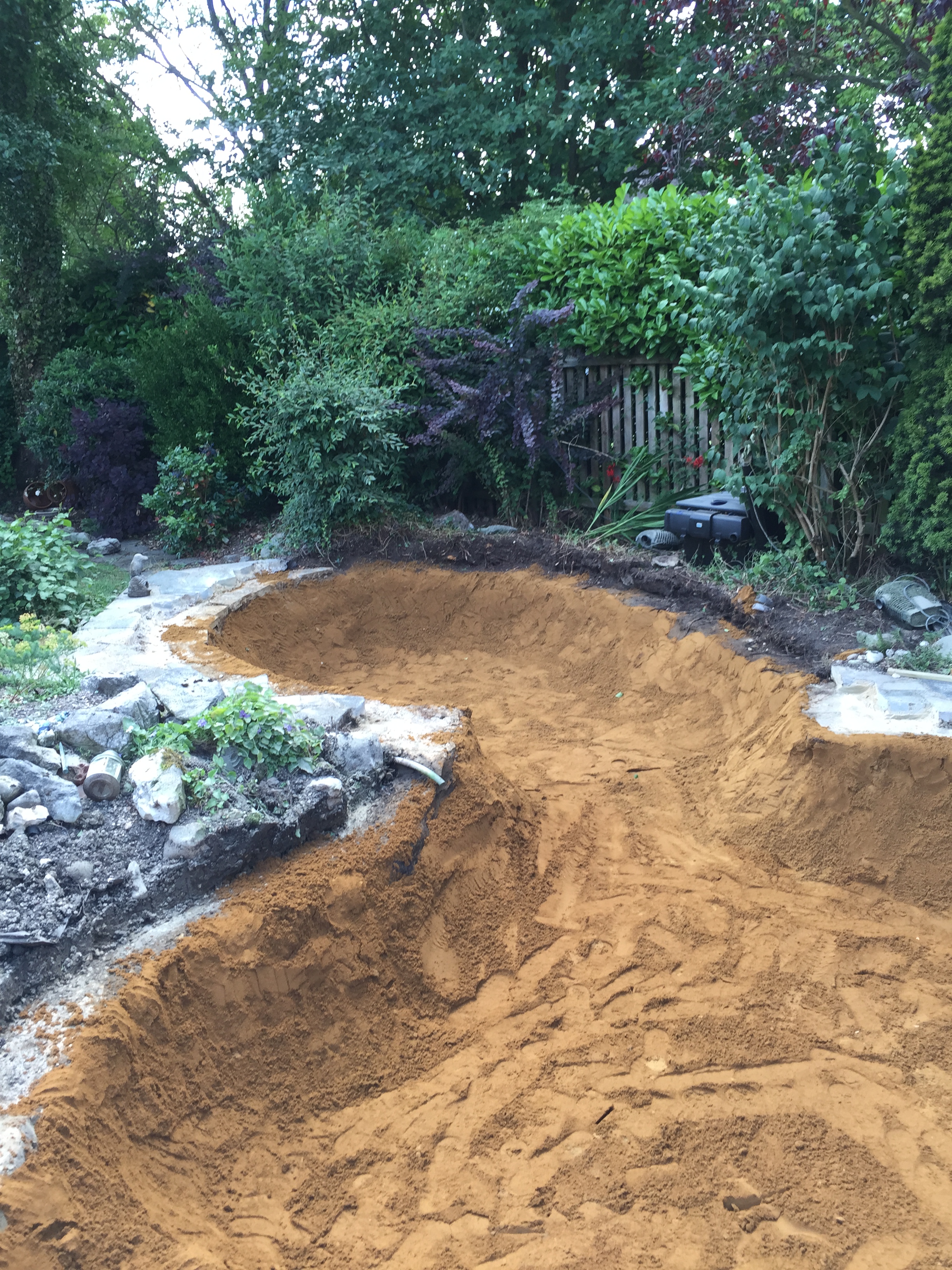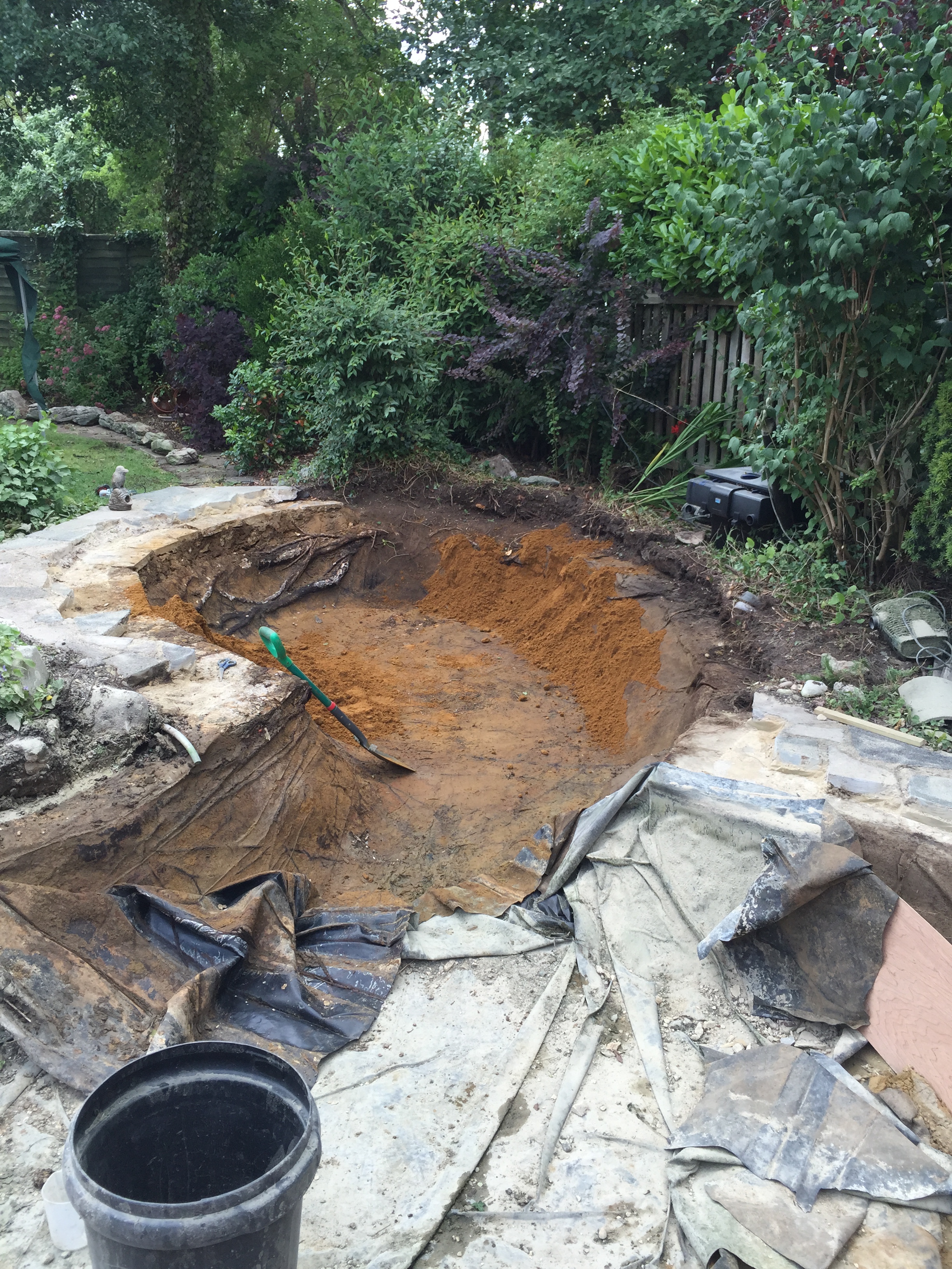 The pond had been overgrown for many years so a lot of initial pruning work had to be done before the edging at the back of the pond could be removed. The crazy paving was carefully removed around the ponds edge along with the large natural rock edge.